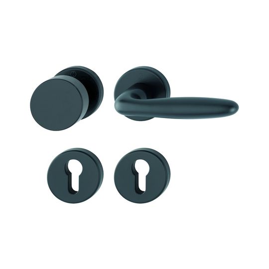 HOPPE Wechselgarnitur Verona 58/42KB/42KBS/1510; Produkttyp: Wechselgarnitur; Produkttyp (Hersteller): Wechselgarnitur; Ausführung: Rosette; Befestigungsart Drückerrosette (außen): aufsteckbar; Befestigungsart Drückerrosette (innen): aufsteckbar; Befestigungsart Schlüsselrosette (außen): aufsteckbar; Befestigungsart Schlüsselrosette (innen): aufsteckbar; Befestigungstechnik: mit Stütznocken; Form Drückerrosette: rund; Form Schlüsselrosette (außen): rund; Form Schlüsselrosette (innen): rund; Vierkant: 8 mm; Material: Aluminium; Form Türgriff (innen): L-Form; Form Türgriff (außen): Flachknopf; Ausführung Türgriff (außen): fest; Gewinde Knopf/Griffplatte: M12; Durchmesser Türgriff (außen): 50; Durchmesser Schlüsselrosette: 52 mm; Länge Türgriff (innen): 124; Höhe Türgriff (innen): 54; Höhe Türgriff (außen): 40; Durchmesser Drückerrosette (außen): 52 mm; Durchmesser Drückerrosette (innen): 52 mm; Höhe Drückerrosette (außen): 9 mm; Höhe Drückerrosette (innen): 9 mm; Höhe Schlüsselrosette (außen): 9 mm; Höhe Schlüsselrosette (innen): 9 mm; Lagerung: wartungsfreies Gleitlager,mit Rückholfeder; Einsatzbereich: Objekttür; Türart: Vollblatt; Türwerkstoff: Holz,Stahl; Lochung: Profilzylinder gelocht; DIN-Richtung: DIN Links-Rechts; Farbe: schwarz; Farbton: schwarz matt; Oberfläche: eloxiert; Ausführung Vierkant: Rollenwechselstift; Türstärke min.: 37 mm; Türstärke max.: 47 mm; Norm: DIN EN 1906