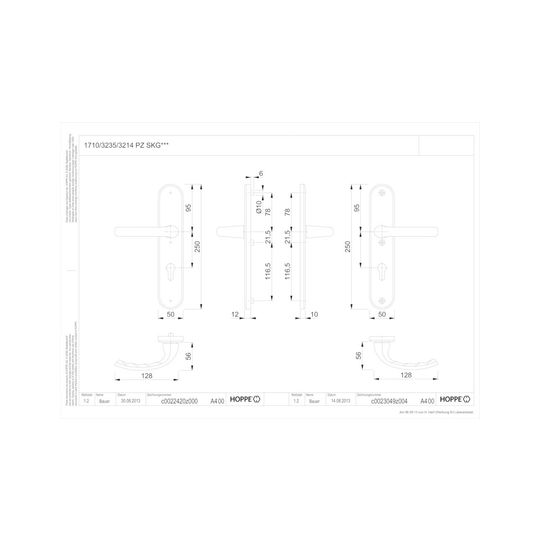 HOPPE Sicherheits-Drückergarnitur Tôkyô 1710/3235/3214; Produkttyp: Sicherheits-Drückergarnitur; Produkttyp (Hersteller): Sicherheits-Drückergarnitur; Ausführung: Langschild; Form: oval; Material: Aluminium; Form Türgriff (innen): gebogen; Form Türgriff (außen): gebogen; Länge Türgriff (innen): 128 mm; Länge Türgriff (außen): 128 mm; Höhe Türgriff (innen): 56 mm; Höhe Türgriff (außen): 56 mm; Gütesiegel: RAL-GZ; Einsatzbereich: Wohnungseingangstür; Türart: Vollblatt; Türwerkstoff: Holz,Stahl; Zylinderabdeckung: ohne Zylinderabdeckung; DIN-Richtung: DIN Links-Rechts; Widerstandsklasse nach NEN 5089: SKG***; Vierkant: 8 mm; Entfernung: 92 mm; Lochung: Profilzylinder gelocht; Ausführung Vierkant: Vierkantvollstift; Farbe: silberfarben; Farbton: naturfarben; Oberfläche: eloxiert; Schildlänge außen: 250 mm; Schildlänge innen: 250 mm; Schildbreite außen: 50 mm; Schildbreite innen: 50 mm; Schildstärke innen: 10 mm; Schildstärke außen: 12 mm; Türstärke min.: 35 mm; Türstärke max.: 40 mm