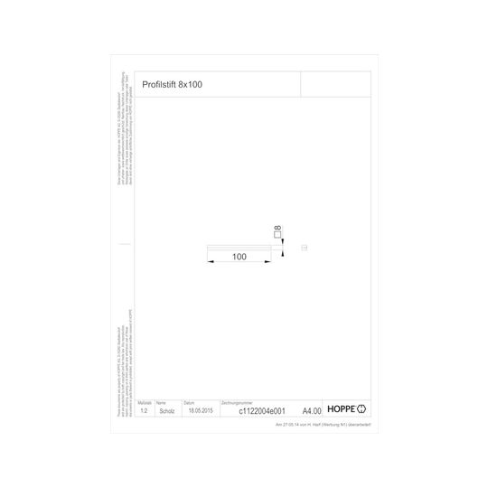 HOPPE Profilstift; Produkttyp: Profilstift; Produkttyp (Hersteller): Profilstift; Material: Eisen; Oberfläche: verzinkt; Einsatzbereich: Türdrücker; Vierkant: 8 mm; Länge: 100 mm; Türstärke min.: 41 mm; Türstärke max.: 50 mm