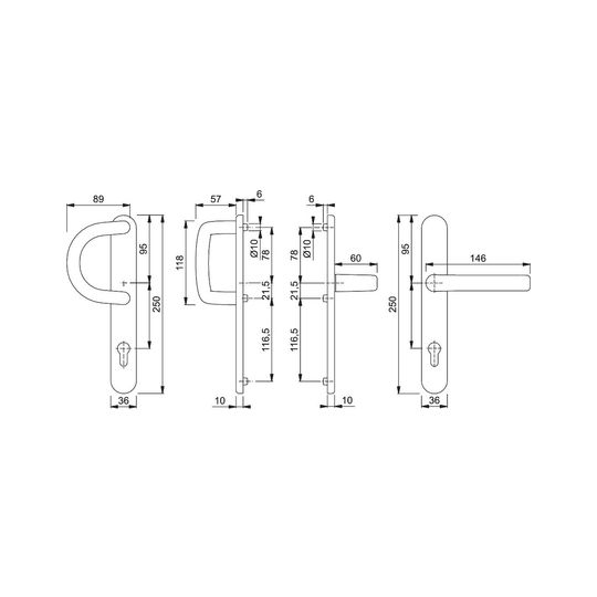 HOPPE Wechselgarnitur Liverpool 538G/3357N/1313G; Produkttyp: Wechselgarnitur; Produkttyp (Hersteller): Wechselgarnitur; Ausführung: Langschild; Befestigungsart: verdeckt verschraubt; Befestigungstechnik: mit Stütznocken; Form: oval; Vierkant: 8 mm; Material: Aluminium; Material Unterkonstruktion: Zamak; Form Türgriff (innen): gekröpft; Form Türgriff (außen): Stoßgriff,gebogen; Ausführung Türgriff (außen): fest; Breite Türgriff (außen): 89 mm; Länge Türgriff (innen): 146 mm; Länge Türgriff (außen): 118 mm; Höhe Türgriff (innen): 60 mm; Höhe Türgriff (außen): 57 mm; Schildbreite außen: 36 mm; Schildbreite innen: 36 mm; Schildlänge außen: 250 mm; Schildlänge innen: 250 mm; Schildstärke außen: 10 mm; Schildstärke innen: 10 mm; Lagerung: wartungsfreies Gleitlager,festdrehbar,mit Rückholfeder; Einsatzbereich: Haustür; Türart: Rohrrahmen; Türwerkstoff: Aluminium,Kunststoff; Lochung: Profilzylinder gelocht; Entfernung: 92 mm; DIN-Richtung: DIN Links-Rechts; Farbe: weiß; Farbton: verkehrsweiß; Oberfläche: beschichtet; Ausführung Vierkant: Vierkantstift; Türstärke min.: 67 mm; Türstärke max.: 72 mm