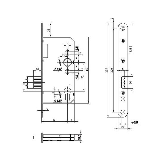 Riegelschloss N1056 80 mm Dornmass PZ72 R3X20X235 mm Din L/R