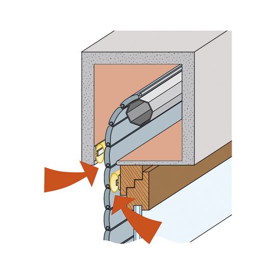 Am Auslassschlitz des Rollladenkastens wird - im Idealfall beidseitig - ein weichmacherfreier und dauerelastischer Silikon-Kautschukschlauch passgenau einmontiert und verschließt so den Spalt nach draußen. Der Schlauch lässt sich mittels einem Trägerprofil und zwei hochwertigen Klebebändern auf staubfreiem Untergrund sicher befestigen.