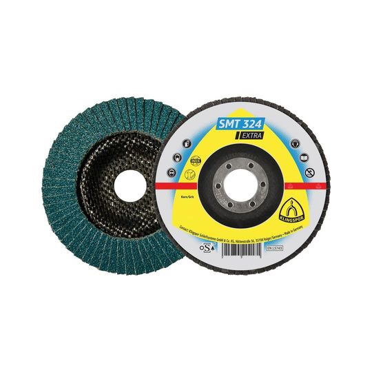 Fächerschleifscheibe SMT 324, gewölbt, Schleifmopteller • Zirkonkorund • Glasgewebeteller • Für Kanten- und Flächenbearbeitung auf Stahl und Edelstahl • Für die Entfernung von Schweißnähten und Graten