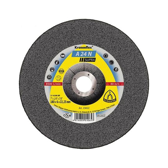 Schruppscheibe für die Edelstahlbearbeitung, A 24 N SupraStandardscheibe für die Edelstahlbearbeitung, entsprechend UVV VBG 49, gute Schleifleistung bei hoher Standzeit, weiche Bindung. Durch die weiche Bindung sehr aggressiv bei Flächenschliff auf Stahl
