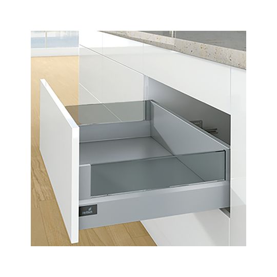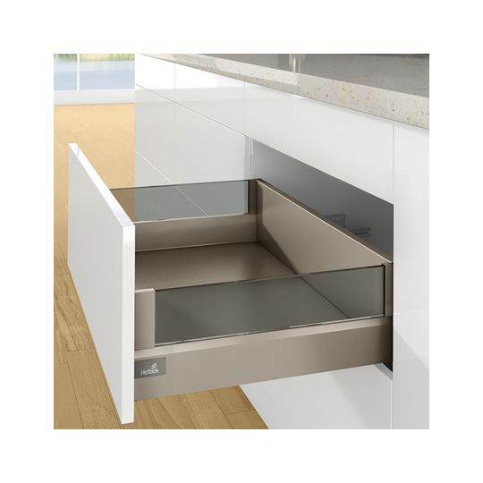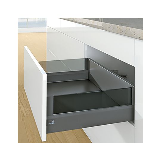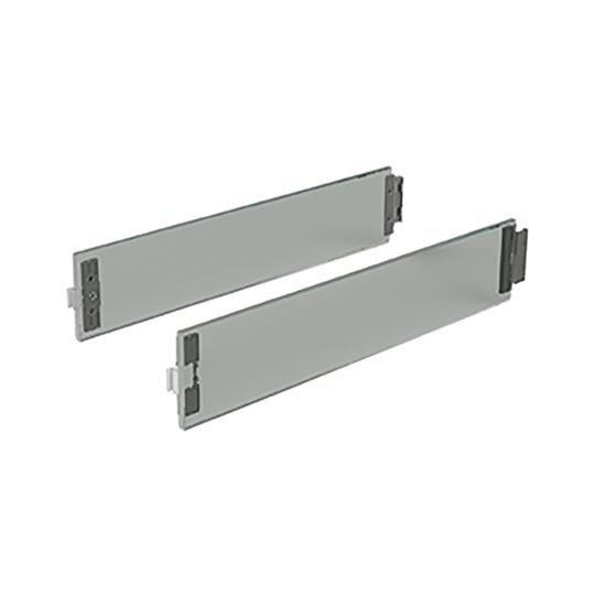 HETTICH Designelement ArciTech 9282681; Ausführung: DesignSide,für seitliche Montage,mit aufgeklebten Verbindern; Werkstoff: Glas; Einsatzbereich: Schubkasten; Farbe: grau; Montage: links/rechts,zum Einklemmen; Nennlänge: 650 mm; Zargenhöhe: 94 + 126 mm; Basis: Designelement; Frontauszugshöhe: 186 + 218 mm