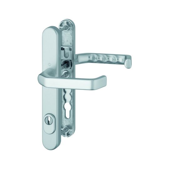 HOPPE Sicherheits-Drückergarnitur Liverpool 1313G/3359ZA/3357N; Produkttyp: Sicherheits-Drückergarnitur; Produkttyp (Hersteller): Sicherheits-Drückergarnitur; Ausführung: Langschild; Form: oval; Material: Aluminium; Form Türgriff (innen): gekröpft,U-Form; Form Türgriff (außen): gekröpft,U-Form; Länge Türgriff (innen): 146 mm; Länge Türgriff (außen): 146 mm; Höhe Türgriff (innen): 60 mm; Höhe Türgriff (außen): 60 mm; Material Unterkonstruktion (innen): Zamak; Material Unterkonstruktion (außen): Stahl; Gütesiegel: RAL-GZ; Einsatzbereich: Haustür; Türart: Rohrrahmen; Türwerkstoff: Aluminium,Kunststoff; Zylinderabdeckung: mit Zylinderabdeckung; DIN-Richtung: DIN Links-Rechts; Widerstandsklasse nach DIN 18257: ES 1; Vierkant: 8 mm; Entfernung: 92 mm; Lochung: Profilzylinder gelocht; Ausführung Vierkant: Vierkantvollstift; Farbe: silberfarben; Farbton: naturfarben; Oberfläche: eloxiert; Schildlänge außen: 250 mm; Schildlänge innen: 250 mm; Schildbreite außen: 36 mm; Schildbreite innen: 36 mm; Schildstärke innen: 10 mm; Schildstärke außen: 15 mm; Zylinderüberstand min.: 10 mm; Zylinderüberstand max.: 18 mm; Türstärke min.: 67 mm; Türstärke max.: 72 mm