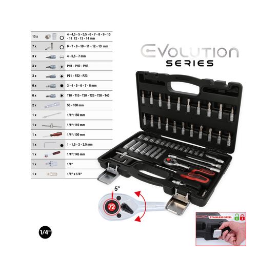 Steckschlüssel-Garnitur 1/4", 53-teiligAus Chrom-Vanadium-Stahl, matt satiniert. Das SUPERLOCK-Profil greift in die Schraube an deren Fläche und sichert eine höhere Kraftübertragung, auch für abger...