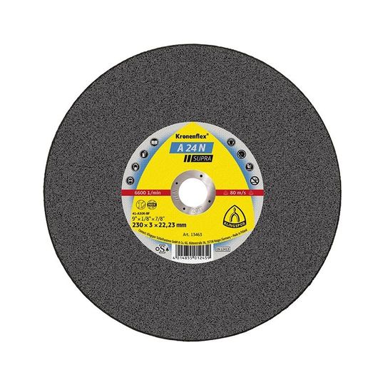 Trennscheibe für die Edelstahlbearbeitung, A 24 N SupraStandardscheibe zur Bearbeitung von Edelstählen, gerade, harte Bindung. Ohne eisen-, schwefel- und chlorhaltige Füllstoffe. Normbohrung 22,23 mm.