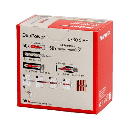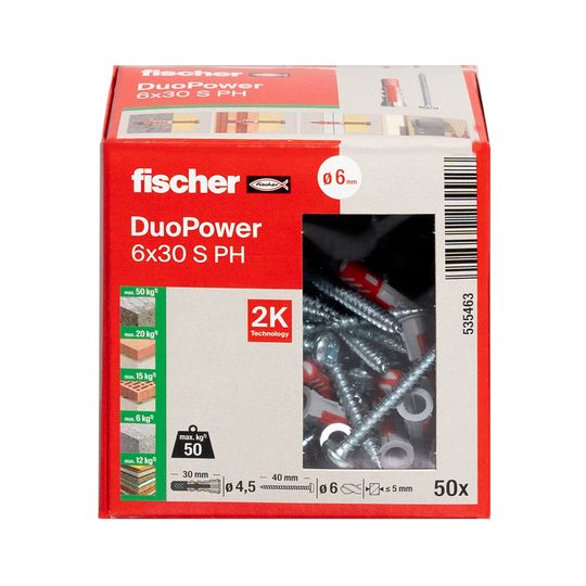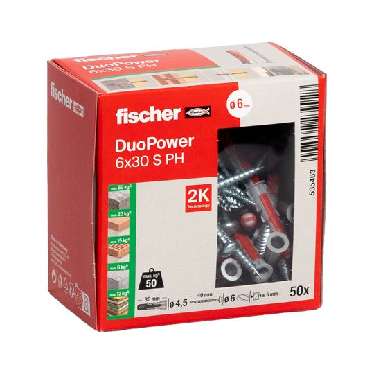 fischer DUOPOWER 6 x 30 S PH; Eigenschaft Dübel: 2K - Technologie; Sicherheitsdatenblatt: Nein; Gütesiegel: Ja; Brandprüfung: Nein; technische Dokumentation: Nein; Lastwerte: Ja; Verankerungsgrund: Gipskarton- und Gipsfaserplatten,Spanplatten,Kalksand-Vollstein,Hochlochziegel,Vollziegel,Porenbeton,Vollstein aus Leichtbeton,Hohldecken aus Ziegel, Beton o. ä.,Beton,Naturstein,Hohlblock aus Leichtbeton,Gipsbauplatte,Vollgips-Platten,Kalksand-Lochstein; Werkstoff Dübel: Kunststoff; Güte Werkstoff Dübel: Polypropylen,Nylon; Werkstoff Schraube: Stahl; Anerkennung Factory Mutual: Nein; DOP - Declaration of Performance: Nein; EPD - Umwelt Produktdeklaration: Nein; Eigenschaft Güte Werkstoff Schraube: korrosionsgeschützt; Montageart: Vorsteckmontage,Durchsteckmontage; Wirkungsweise: Reibschluss; Eigenschaft: mit passender Schraube 4,0 x 35 für perfekten Halt,Kombination aus zwei Materialkomponenten für mehr Leistung,mit passender Sicherheitsschraube 7,0 x 69 f. perfekten Halt,mit je 20 Aufkleber in schwarz, weiß braun und grau,mit passender Schraube 4,5 x 40 für perfekten Halt,mit je 10 Aufkleber in schwarz, weiß braun und grau,mit passender Schraube 5,0 x 60 für perfekten Halt,schmaler Dübelrand verhindert d. Tieferrutschen ins Bohrloch,Funktionen für Voll- (Spreizen) und Lochbaustoffe (Klappen),bestmögliche Rückmeldung des Dübels; Feuerwiderstandsklasse: keine; Oberfläche Schraube: galvanisch verzinkt; Prüfzeichen: Nein; Anwendungsbereich: Bad und WC-Einrichtungen,Dunstabzugshauben,Sanitär/Heizung/Klima-Befestigungen,TV-Konsolen,Wandregale,Hängeschränke,Waschtischbefestigungen,Leuchten,Spiegelschränke,Briefkastenanlagen,Fensterrollo,Gardinenschienen,Bilder; Inhalt: 50 x DUOPOWER 6 x 30,50 x Panheadschraube 4,5 x 40; Bohrernenndurchmesser: 6 mm; Dicke des Anbauteils max.: 6; Schraubenabmessung: 4,5 x 40; Länge Dübel: 30; Einschraubtiefe min.: 34; Plattendicke min.: 12,5 mm; Bohrlochtiefe min.: 45