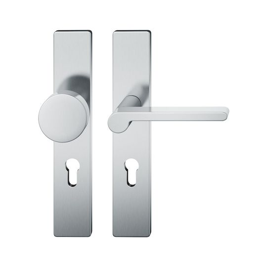 FSB Wechselgarnitur 12 1021; Material: Edelstahl; Befestigungsart: verdeckt verschraubt; Befestigungstechnik: mit Stütznocken; Vierkant: 8 mm; Befestigungssystem: Stiftverbindung; Abdeckung: Langschild; Lagerung: ASL®,festdrehbar; Form: eckig; Benutzerklasse: Klasse 4; Einsatzbereich: Objekttür; Basis: Wechselgarnitur; Lochung: Profilzylinder gelocht; Entfernung: 72 mm; Türstärke min.: 39 mm; Türstärke max.: 58 mm; Knopfhöhe: 44 mm; Knopfform: rund; DIN-Richtung: DIN Rechts; Norm: DIN EN 1906; Breite: 45 mm; Länge: 245 mm; Oberfläche: poliert; Farbton: edelstahl; Türart: Außentüren; Drückerbefestigung: Wechselstift mit Rolle; Anschlagrichtung: Drücker rechts zeigend; Knopfdurchmesser: 55 mm; Türwerkstoff: Holz,Stahl; Lieferung: mit Befestigungsmaterial; Betätigungswinkel max.: 45 °; Drückerhöhe: 60 mm; Drückerlänge: 137 mm; Schildstärke außen: 7 mm; Schildstärke innen: 7 mm; Material Unterkonstruktion: Kunststoff-Edelstahl verstärkt; Drückerform: L-Form