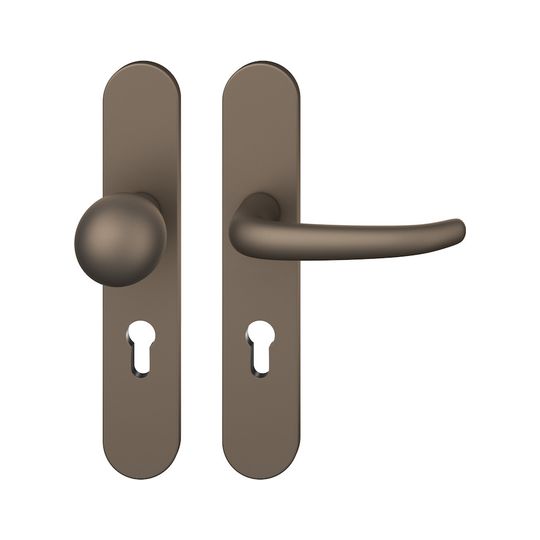 FSB Wechselgarnitur 12 1023; Material: Aluminium; Befestigungsart: verdeckt verschraubt; Befestigungstechnik: mit Stütznocken; Vierkant: 8 mm; Befestigungssystem: Stiftverbindung; Abdeckung: Langschild; Lagerung: ASL®,festdrehbar; Form: oval; Benutzerklasse: Klasse 4; Einsatzbereich: Objekttür; Basis: Wechselgarnitur; Lochung: Profilzylinder gelocht; Entfernung: 72 mm; Türstärke min.: 39 mm; Türstärke max.: 58 mm; Knopfhöhe: 70 mm; Knopfform: Kugelform; DIN-Richtung: DIN Links-Rechts; Norm: DIN EN 1906; Breite: 45 mm; Länge: 245 mm; Oberfläche: gestrahlt,eloxiert; Farbton: mittelbronzefarbig; Türart: Außentüren; Drückerbefestigung: Wechselstift mit Rolle; Anschlagrichtung: Drücker rechts/links verwendbar; Knopfdurchmesser: 50 mm; Türwerkstoff: Holz,Stahl; Lieferung: mit Befestigungsmaterial; Betätigungswinkel max.: 45 °; Drückerhöhe: 58 mm; Drückerlänge: 135 mm; Schildstärke außen: 7 mm; Schildstärke innen: 7 mm; Material Unterkonstruktion: Kunststoff-Edelstahl verstärkt; Drückerform: gebogen