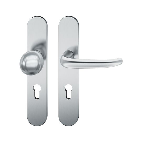 FSB Wechselgarnitur 12 1023; Material: Edelstahl; Befestigungsart: verdeckt verschraubt; Befestigungstechnik: mit Stütznocken; Vierkant: 8 mm; Befestigungssystem: Stiftverbindung; Abdeckung: Langschild; Lagerung: ASL®,festdrehbar; Form: oval; Benutzerklasse: Klasse 4; Einsatzbereich: Objekttür; Basis: Wechselgarnitur; Lochung: Profilzylinder gelocht; Entfernung: 92 mm; Türstärke min.: 39 mm; Türstärke max.: 58 mm; Knopfhöhe: 66 mm; Knopfform: Kugelform; DIN-Richtung: DIN Links-Rechts; Norm: DIN EN 1906; Breite: 45 mm; Länge: 245 mm; Oberfläche: poliert; Farbton: edelstahl; Türart: Außentüren; Drückerbefestigung: Wechselstift mit Rolle; Anschlagrichtung: Drücker rechts/links verwendbar; Knopfdurchmesser: 50 mm; Türwerkstoff: Holz,Stahl; Lieferung: mit Befestigungsmaterial; Betätigungswinkel max.: 45 °; Drückerhöhe: 58 mm; Drückerlänge: 135 mm; Schildstärke außen: 7 mm; Schildstärke innen: 7 mm; Material Unterkonstruktion: Kunststoff-Edelstahl verstärkt; Drückerform: gebogen