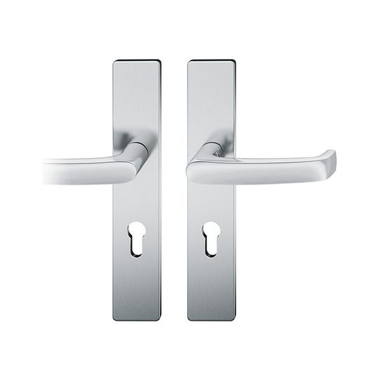 FSB Wechselgarnitur 12 1045; Material: Aluminium; Befestigungsart: verdeckt verschraubt; Befestigungstechnik: mit Stütznocken; Vierkant: 8 mm; Befestigungssystem: Stiftverbindung; Abdeckung: Langschild; Lagerung: ASL®,festdrehbar; Form: eckig; Benutzerklasse: Klasse 4; Einsatzbereich: Objekttür; Basis: Wechselgarnitur; Lochung: Profilzylinder gelocht; Entfernung: 72 mm; Türstärke min.: 39 mm; Türstärke max.: 58 mm; Knopfhöhe: 44 mm; Knopfform: rund; DIN-Richtung: DIN Links-Rechts; Norm: DIN EN 1906; Breite: 45 mm; Länge: 245 mm; Oberfläche: eloxiert; Farbton: naturfarbig; Türart: Außentüren; Drückerbefestigung: Wechselstift mit Rolle; Anschlagrichtung: Drücker rechts/links verwendbar; Knopfdurchmesser: 50 mm; Türwerkstoff: Holz,Stahl; Lieferung: mit Befestigungsmaterial; Betätigungswinkel max.: 45 °; Drückerhöhe: 54 mm; Drückerlänge: 132 mm; Ausführung: mit Knopf 0829; Schildstärke außen: 7 mm; Schildstärke innen: 7 mm; Material Unterkonstruktion: Kunststoff-Edelstahl verstärkt; Drückerform: gebogen