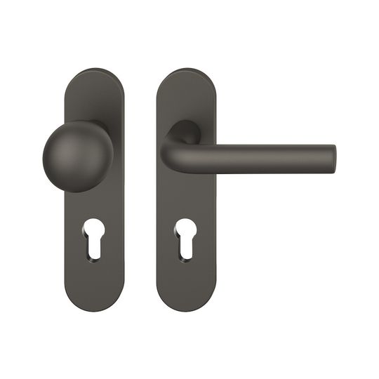 FSB Wechselgarnitur 12 1075; Material: Aluminium; Befestigungsart: verdeckt verschraubt; Befestigungstechnik: mit Stütznocken; Vierkant: 8 mm; Befestigungssystem: Stiftverbindung; Abdeckung: Kurzschild; Lagerung: ASL®,festdrehbar; Form: oval; Benutzerklasse: Klasse 4; Einsatzbereich: Objekttür; Basis: Wechselgarnitur; Lochung: Profilzylinder gelocht; Entfernung: 72 mm; Türstärke min.: 39 mm; Türstärke max.: 58 mm; DIN-Richtung: DIN Links-Rechts; Anschlagrichtung: Drücker rechts/links verwendbar; Drückerdurchmesser: 20 mm; Breite: 45 mm; Länge: 185 mm; Oberfläche: gestrahlt,eloxiert; Farbton: dunkelbronzefarbig; Norm: DIN EN 1906; Türart: Außentüren; Drückerbefestigung: Wechselstift mit Rolle; Knopfdurchmesser: 50 mm; Knopfhöhe: 70 mm; Türwerkstoff: Holz,Stahl; Lieferung: mit Befestigungsmaterial; Betätigungswinkel max.: 45 °; Drückerhöhe: 62 mm; Drückerlänge: 132 mm; Knopfform: Kugelform; Schildstärke außen: 7 mm; Schildstärke innen: 7 mm; Material Unterkonstruktion: Kunststoff-Edelstahl verstärkt; Drückerform: L-Form