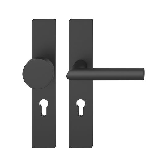 FSB Wechselgarnitur 12 1076; Material: Aluminium; Befestigungsart: verdeckt verschraubt; Befestigungstechnik: mit Stütznocken; Vierkant: 8 mm; Befestigungssystem: Stiftverbindung; Abdeckung: Langschild; Lagerung: ASL®,festdrehbar; Form: eckig; Benutzerklasse: Klasse 4; Einsatzbereich: Objekttür; Basis: Wechselgarnitur; Lochung: Profilzylinder gelocht; Entfernung: 92 mm; Türstärke min.: 39 mm; Türstärke max.: 58 mm; Knopfhöhe: 44 mm; Knopfform: rund; DIN-Richtung: DIN Links-Rechts; Norm: DIN EN 1906; Drückerdurchmesser: 21 mm; Breite: 45 mm; Länge: 245 mm; Farbe: schwarz; Oberfläche: gestrahlt,eloxiert; Türart: Außentüren; Drückerbefestigung: Wechselstift mit Rolle; Anschlagrichtung: Drücker rechts/links verwendbar; Knopfdurchmesser: 50 mm; Türwerkstoff: Holz,Stahl; Lieferung: mit Befestigungsmaterial; Betätigungswinkel max.: 45 °; Drückerhöhe: 82 mm; Drückerlänge: 137 mm; Schildstärke außen: 7 mm; Schildstärke innen: 7 mm; Material Unterkonstruktion: Kunststoff-Edelstahl verstärkt; Drückerform: Gehrung,gerade