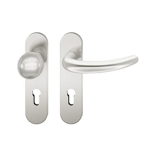 FSB Wechselgarnitur 12 1160; Material: Edelstahl; Befestigungsart: verdeckt verschraubt; Befestigungstechnik: mit Stütznocken; Vierkant: 8 mm; Befestigungssystem: Stiftverbindung; Abdeckung: Kurzschild; Lagerung: ASL®,festdrehbar; Form: oval; Benutzerklasse: Klasse 4; Einsatzbereich: Objekttür; Basis: Wechselgarnitur; Lochung: Profilzylinder gelocht; Entfernung: 72 mm; Türstärke min.: 39 mm; Türstärke max.: 58 mm; DIN-Richtung: DIN Links-Rechts; Anschlagrichtung: Drücker rechts/links verwendbar; Breite: 45 mm; Länge: 185 mm; Oberfläche: fein matt; Farbton: edelstahl; Norm: DIN EN 1906; Türart: Außentüren; Drückerbefestigung: Wechselstift mit Rolle; Knopfdurchmesser: 50 mm; Knopfhöhe: 66 mm; Türwerkstoff: Holz,Stahl; Lieferung: mit Befestigungsmaterial; Betätigungswinkel max.: 45 °; Drückerhöhe: 65,5 mm; Drückerlänge: 146 mm; Ausführung: mit Knopf 0802; Knopfform: Kugelform; Schildstärke außen: 7 mm; Schildstärke innen: 7 mm; Material Unterkonstruktion: Kunststoff-Edelstahl verstärkt; Drückerform: gebogen