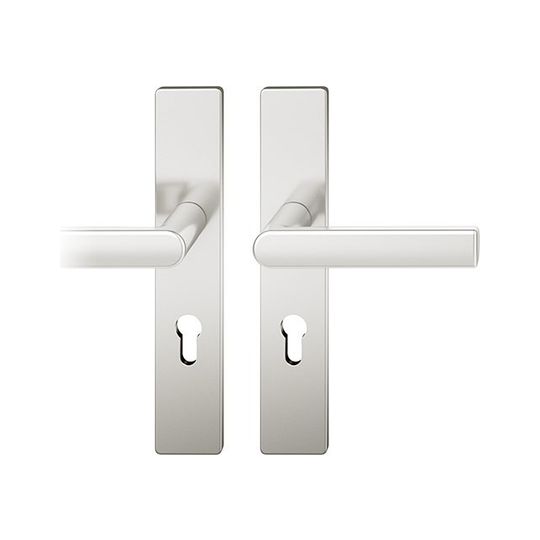 FSB Wechselgarnitur 12 1244; Material: Edelstahl; Befestigungsart: verdeckt verschraubt; Befestigungstechnik: mit Stütznocken; Vierkant: 8 mm; Befestigungssystem: Stiftverbindung; Abdeckung: Langschild; Lagerung: ASL®,festdrehbar; Form: eckig; Benutzerklasse: Klasse 4; Einsatzbereich: Objekttür; Basis: Wechselgarnitur; Lochung: Profilzylinder gelocht; Entfernung: 72 mm; Türstärke min.: 39 mm; Türstärke max.: 58 mm; Knopfhöhe: 44 mm; Knopfform: rund; DIN-Richtung: DIN Links-Rechts; Norm: DIN EN 1906; Breite: 45 mm; Länge: 245 mm; Oberfläche: fein matt; Farbton: edelstahl; Türart: Außentüren; Drückerbefestigung: Wechselstift mit Rolle; Anschlagrichtung: Drücker rechts/links verwendbar; Knopfdurchmesser: 55 mm; Türwerkstoff: Holz,Stahl; Lieferung: mit Befestigungsmaterial; Betätigungswinkel max.: 45 °; Drückerhöhe: 57,5 mm; Drückerlänge: 140 mm; Design: gmp Architekten von Gerkan, Marg und Partner; Ausführung: mit Knopf 0829; Schildstärke außen: 7 mm; Schildstärke innen: 7 mm; Material Unterkonstruktion: Kunststoff-Edelstahl verstärkt; Drückerform: Design,L-Form