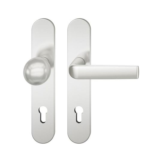 FSB Wechselgarnitur 12 1267; Material: Aluminium; Befestigungsart: verdeckt verschraubt; Befestigungstechnik: mit Stütznocken; Vierkant: 8 mm; Befestigungssystem: Stiftverbindung; Abdeckung: Langschild; Lagerung: festdrehbar,ASL®; Form: oval; Benutzerklasse: Klasse 4; Einsatzbereich: Objekttür; Basis: Wechselgarnitur; Lochung: Profilzylinder gelocht; Entfernung: 92 mm; Türstärke min.: 39 mm; Türstärke max.: 58 mm; Knopfhöhe: 70 mm; Knopfform: Kugelform; DIN-Richtung: DIN Links-Rechts; Norm: DIN EN 1906; Breite: 45 mm; Länge: 245 mm; Oberfläche: eloxiert; Farbton: naturfarbig; Türart: Außentüren; Drückerbefestigung: Wechselstift mit Rolle; Anschlagrichtung: Drücker rechts/links verwendbar; Knopfdurchmesser: 50 mm; Türwerkstoff: Holz,Stahl; Lieferung: mit Befestigungsmaterial; Betätigungswinkel max.: 45 °; Schildstärke außen: 7 mm; Schildstärke innen: 7 mm; Material Unterkonstruktion: Kunststoff-Edelstahl verstärkt; Drückerform: L-Form