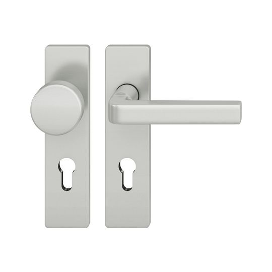 FSB Wechselgarnitur 72 1004; Material: Aluminium; Befestigungsart: verdeckt verschraubt; Befestigungstechnik: mit Stütznocken; Vierkant: 8 mm; Befestigungssystem: Stiftverbindung; Abdeckung: Kurzschild; Lagerung: festdrehbar,Ausgleichslager® 3; Form: eckig; Benutzerklasse: Klasse 4; Einsatzbereich: Objekttür; Basis: Wechselgarnitur; Lochung: Profilzylinder gelocht; Entfernung: 72 mm; Türstärke min.: 39 mm; Türstärke max.: 48 mm; DIN-Richtung: DIN Links; Anschlagrichtung: Drücker links zeigend; Breite: 45 mm; Länge: 185 mm; Oberfläche: eloxiert; Farbton: naturfarbig; Norm: DIN EN 1906; Türart: Außentüren; Drückerbefestigung: Stabil-Wechselstift mit Rolle; Eigenschaft: Knopf fest auf Schild; Knopfdurchmesser: 50 mm; Knopfhöhe: 44 mm; Türwerkstoff: Holz,Stahl; Lieferung: mit Befestigungsmaterial; Betätigungswinkel max.: 35 °; Drückerhöhe: 57 mm; Drückerlänge: 133 mm; Design: David Chipperfield; Ausführung: mit Knopf 0829; Knopfform: rund; Schildstärke außen: 7 mm; Schildstärke innen: 7 mm; Drückerform: L-Form