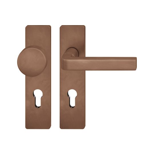 FSB Wechselgarnitur 72 1004; Material: Bronze; Befestigungsart: verdeckt verschraubt; Befestigungstechnik: mit Stütznocken; Vierkant: 8 mm; Befestigungssystem: Stiftverbindung; Abdeckung: Kurzschild; Lagerung: festdrehbar,Ausgleichslager® 3; Form: eckig; Benutzerklasse: Klasse 4; Einsatzbereich: Objekttür; Basis: Wechselgarnitur; Lochung: Profilzylinder gelocht; Entfernung: 72 mm; Türstärke min.: 39 mm; Türstärke max.: 48 mm; DIN-Richtung: DIN Links; Anschlagrichtung: Drücker links zeigend; Breite: 45 mm; Länge: 185 mm; Oberfläche: patiniert gewachst; Farbton: hellbronze; Norm: DIN EN 1906; Türart: Außentüren; Drückerbefestigung: Stabil-Wechselstift mit Rolle; Eigenschaft: Knopf fest auf Schild; Knopfdurchmesser: 50 mm; Knopfhöhe: 44 mm; Türwerkstoff: Holz,Stahl; Lieferung: mit Befestigungsmaterial; Betätigungswinkel max.: 35 °; Drückerhöhe: 57 mm; Drückerlänge: 133 mm; Design: David Chipperfield; Ausführung: mit Knopf 0829; Knopfform: rund; Schildstärke außen: 7 mm; Schildstärke innen: 7 mm; Drückerform: L-Form