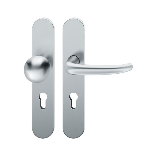 FSB Wechselgarnitur 72 1023; Material: Edelstahl; Befestigungsart: verdeckt verschraubt; Befestigungstechnik: mit Stütznocken; Vierkant: 8 mm; Befestigungssystem: Stiftverbindung; Abdeckung: Langschild; Lagerung: Ausgleichslager® 3,festdrehbar; Form: oval; Benutzerklasse: Klasse 4; Einsatzbereich: Objekttür; Basis: Wechselgarnitur; Lochung: Profilzylinder gelocht; Entfernung: 72 mm; Türstärke min.: 39 mm; Türstärke max.: 48 mm; Knopfhöhe: 66 mm; Knopfform: Kugelform; DIN-Richtung: DIN Links; Norm: DIN EN 1906; Eigenschaft: Knopf fest auf Schild; Breite: 45 mm; Länge: 245 mm; Oberfläche: fein matt; Farbton: edelstahl; Türart: Außentüren; Drückerbefestigung: Stabil-Wechselstift mit Rolle; Anschlagrichtung: Drücker links zeigend; Knopfdurchmesser: 50 mm; Türwerkstoff: Holz,Stahl; Lieferung: mit Befestigungsmaterial; Betätigungswinkel max.: 35 °; Drückerhöhe: 58 mm; Drückerlänge: 135 mm; Ausführung: mit Knopf 0802; Schildstärke außen: 7 mm; Schildstärke innen: 7 mm; Drückerform: gebogen