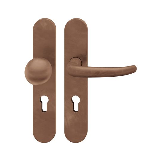 FSB Wechselgarnitur 72 1023; Material: Bronze; Befestigungsart: verdeckt verschraubt; Befestigungstechnik: mit Stütznocken; Vierkant: 8 mm; Befestigungssystem: Stiftverbindung; Abdeckung: Langschild; Lagerung: Ausgleichslager® 3,festdrehbar; Form: oval; Benutzerklasse: Klasse 4; Einsatzbereich: Objekttür; Basis: Wechselgarnitur; Lochung: Profilzylinder gelocht; Entfernung: 72 mm; Türstärke min.: 39 mm; Türstärke max.: 48 mm; Knopfhöhe: 65 mm; Knopfform: Kugelform; DIN-Richtung: DIN Links; Norm: DIN EN 1906; Eigenschaft: Knopf fest auf Schild; Breite: 45 mm; Länge: 245 mm; Oberfläche: patiniert gewachst; Farbton: hellbronze; Türart: Außentüren; Drückerbefestigung: Stabil-Wechselstift mit Rolle; Anschlagrichtung: Drücker links zeigend; Knopfdurchmesser: 50 mm; Türwerkstoff: Holz,Stahl; Lieferung: mit Befestigungsmaterial; Betätigungswinkel max.: 35 °; Drückerhöhe: 58 mm; Drückerlänge: 135 mm; Ausführung: mit Knopf 0802; Schildstärke außen: 7 mm; Schildstärke innen: 7 mm; Drückerform: gebogen