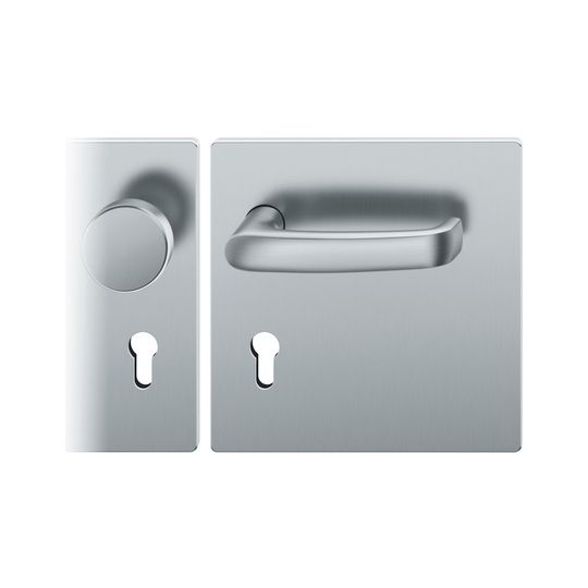 FSB Wechselgarnitur 72 1045; Produkttyp: Wechselgarnitur; Produkttyp (Hersteller): Wechselgarnitur; Ausführung: Breitschild; Befestigungsart: verdeckt verschraubt; Befestigungstechnik: mit Stütznocken; Form: eckig; Vierkant: 8 mm; Material: Edelstahl; Form Türgriff (innen): gebogen; Form Türgriff (außen): Flachknopf; Gewinde Knopf/Griffplatte: M12; Durchmesser Türgriff (außen): 55 mm; Länge Türgriff (innen): 132 mm; Höhe Türgriff (außen): 44 mm; Schildbreite außen: 185 mm; Schildbreite innen: 185 mm; Schildlänge außen: 185 mm; Schildlänge innen: 185 mm; Schildstärke außen: 7 mm; Schildstärke innen: 7 mm; Lagerung: Ausgleichslager® 3,festdrehbar; Einsatzbereich: Objekttür; Türart: Vollblatt; Türwerkstoff: Holz; Norm: DIN EN 1906; Lochung: Profilzylinder gelocht; Entfernung: 72 mm; DIN-Richtung: DIN Rechts; Farbe: grau; Farbton: edelstahl; Oberfläche: fein matt; Ausführung Vierkant: Rollenwechselstift; Betätigungswinkel max.: 35 °; Türstärke min.: 39 mm; Türstärke max.: 48 mm