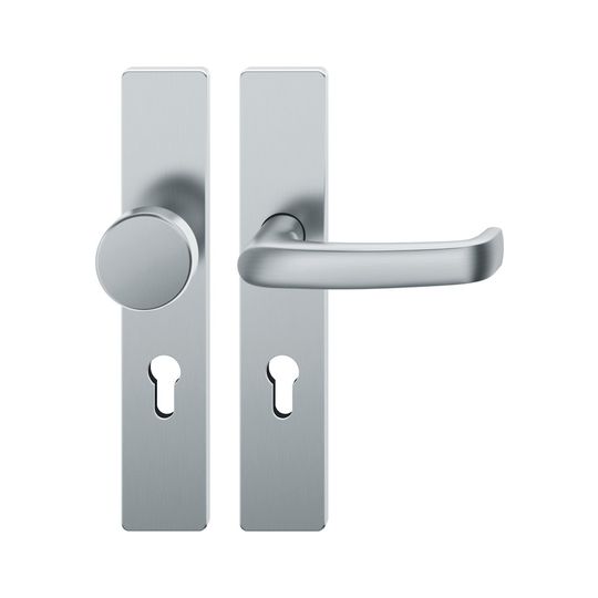 FSB Wechselgarnitur 72 1045; Material: Edelstahl; Befestigungsart: verdeckt verschraubt; Befestigungstechnik: mit Stütznocken; Vierkant: 8 mm; Befestigungssystem: Stiftverbindung; Abdeckung: Langschild; Lagerung: Ausgleichslager® 3,festdrehbar; Form: eckig; Benutzerklasse: Klasse 4; Einsatzbereich: Objekttür; Basis: Wechselgarnitur; Lochung: Profilzylinder gelocht; Entfernung: 72 mm; Türstärke min.: 39 mm; Türstärke max.: 48 mm; Knopfhöhe: 44 mm; Knopfform: rund; DIN-Richtung: DIN Links; Norm: DIN EN 1906; Eigenschaft: Knopf fest auf Schild; Breite: 45 mm; Länge: 245 mm; Oberfläche: fein matt; Farbton: edelstahl; Türart: Außentüren; Drückerbefestigung: Stabil-Wechselstift mit Rolle; Anschlagrichtung: Drücker links zeigend; Knopfdurchmesser: 55 mm; Türwerkstoff: Holz,Stahl; Lieferung: mit Befestigungsmaterial; Betätigungswinkel max.: 35 °; Drückerhöhe: 54 mm; Drückerlänge: 132 mm; Ausführung: mit Knopf 0829; Schildstärke außen: 7 mm; Schildstärke innen: 7 mm; Drückerform: gebogen