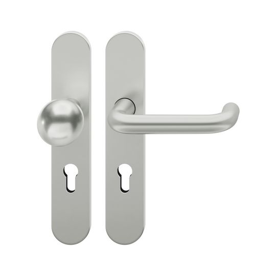 FSB Wechselgarnitur 72 1070; Material: Aluminium; Befestigungsart: verdeckt verschraubt; Befestigungstechnik: mit Stütznocken; Vierkant: 8 mm; Befestigungssystem: Stiftverbindung; Abdeckung: Langschild; Lagerung: Ausgleichslager® 3,festdrehbar; Form: oval; Benutzerklasse: Klasse 4; Einsatzbereich: Objekttür; Basis: Wechselgarnitur; Lochung: Profilzylinder gelocht; Entfernung: 72 mm; Türstärke min.: 39 mm; Türstärke max.: 48 mm; Knopfhöhe: 70 mm; Knopfform: Kugelform; DIN-Richtung: DIN Links; Norm: DIN EN 1906; Eigenschaft: Knopf fest auf Schild; Drückerdurchmesser: 20 mm; Breite: 45 mm; Länge: 245 mm; Oberfläche: eloxiert; Farbton: naturfarbig; Türart: Außentüren; Drückerbefestigung: Stabil-Wechselstift mit Rolle; Anschlagrichtung: Drücker links zeigend; Knopfdurchmesser: 50 mm; Türwerkstoff: Holz,Stahl; Lieferung: mit Befestigungsmaterial; Betätigungswinkel max.: 35 °; Drückerhöhe: 62 mm; Drückerlänge: 145 mm; Ausführung: mit Knopf 0802; Schildstärke außen: 7 mm; Schildstärke innen: 7 mm; Drückerform: U-Form