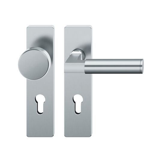 FSB Wechselgarnitur 72 1102; Material: Edelstahl; Befestigungsart: verdeckt verschraubt; Befestigungstechnik: mit Stütznocken; Vierkant: 8 mm; Befestigungssystem: Stiftverbindung; Abdeckung: Kurzschild; Lagerung: festdrehbar,Ausgleichslager® 3; Form: eckig; Benutzerklasse: Klasse 4; Einsatzbereich: Objekttür; Basis: Wechselgarnitur; Lochung: Profilzylinder gelocht; Entfernung: 72 mm; Türstärke min.: 39 mm; Türstärke max.: 48 mm; DIN-Richtung: DIN Links; Anschlagrichtung: Drücker links zeigend; Drückerdurchmesser: 22 mm; Breite: 45 mm; Länge: 185 mm; Oberfläche: fein matt; Farbton: edelstahl; Norm: DIN EN 1906; Türart: Außentüren; Drückerbefestigung: Stabil-Wechselstift mit Rolle; Eigenschaft: Knopf fest auf Schild; Knopfdurchmesser: 55 mm; Knopfhöhe: 44 mm; Türwerkstoff: Holz,Stahl; Lieferung: mit Befestigungsmaterial; Betätigungswinkel max.: 35 °; Drückerhöhe: 60 mm; Drückerlänge: 127 mm; Design: Alessandro Mendini; Ausführung: mit Knopf 0829; Knopfform: rund; Schildstärke außen: 7 mm; Schildstärke innen: 7 mm; Drückerform: L-Form