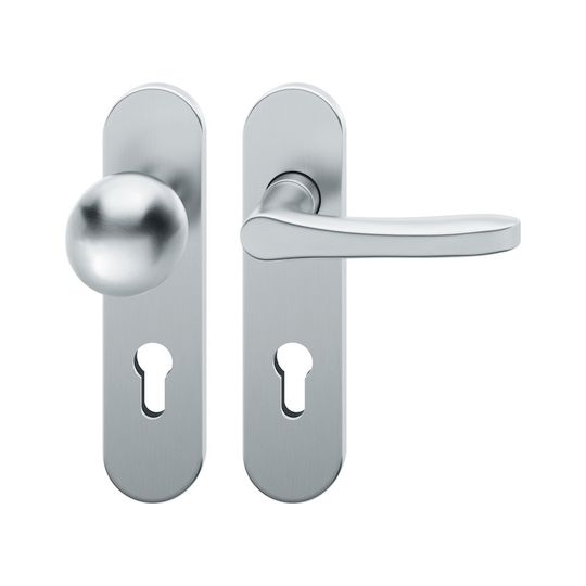 FSB Wechselgarnitur 72 1106; Material: Edelstahl; Befestigungsart: verdeckt verschraubt; Befestigungstechnik: mit Stütznocken; Vierkant: 8 mm; Befestigungssystem: Stiftverbindung; Abdeckung: Kurzschild; Lagerung: Ausgleichslager® 3,festdrehbar; Form: oval; Benutzerklasse: Klasse 4; Einsatzbereich: Objekttür; Basis: Wechselgarnitur; Lochung: Profilzylinder gelocht; Entfernung: 72 mm; Türstärke min.: 39 mm; Türstärke max.: 48 mm; DIN-Richtung: DIN Rechts; Anschlagrichtung: Drücker rechts zeigend; Breite: 45 mm; Länge: 185 mm; Oberfläche: fein matt; Farbton: edelstahl; Norm: DIN EN 1906; Türart: Außentüren; Drückerbefestigung: Stabil-Wechselstift mit Rolle; Eigenschaft: Knopf fest auf Schild; Knopfdurchmesser: 50 mm; Knopfhöhe: 66 mm; Türwerkstoff: Holz,Stahl; Lieferung: mit Befestigungsmaterial; Betätigungswinkel max.: 35 °; Drückerhöhe: 60 mm; Drückerlänge: 119 mm; Design: Christoph Mäckler; Ausführung: mit Knopf 0802; Knopfform: Kugelform; Schildstärke außen: 7 mm; Schildstärke innen: 7 mm; Drückerform: L-Form,gebogen