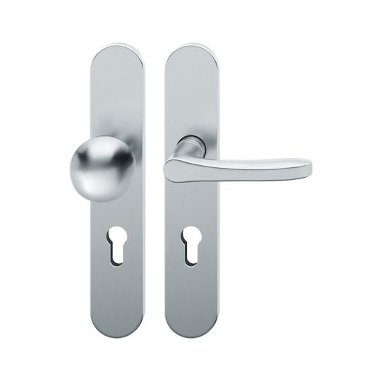 FSB Wechselgarnitur 72 1106; Material: Edelstahl; Befestigungsart: verdeckt verschraubt; Befestigungstechnik: mit Stütznocken; Vierkant: 8 mm; Befestigungssystem: Stiftverbindung; Abdeckung: Langschild; Lagerung: Ausgleichslager® 3,festdrehbar; Form: oval; Benutzerklasse: Klasse 4; Einsatzbereich: Objekttür; Basis: Wechselgarnitur; Lochung: Profilzylinder gelocht; Entfernung: 72 mm; Türstärke min.: 39 mm; Türstärke max.: 48 mm; Knopfhöhe: 66 mm; Knopfform: Kugelform; DIN-Richtung: DIN Links; Norm: DIN EN 1906; Eigenschaft: Knopf fest auf Schild; Breite: 45 mm; Länge: 245 mm; Oberfläche: fein matt; Farbton: edelstahl; Türart: Außentüren; Drückerbefestigung: Stabil-Wechselstift mit Rolle; Anschlagrichtung: Drücker links zeigend; Knopfdurchmesser: 50 mm; Türwerkstoff: Holz,Stahl; Lieferung: mit Befestigungsmaterial; Betätigungswinkel max.: 35 °; Drückerhöhe: 60 mm; Drückerlänge: 119 mm; Design: Christoph Mäckler; Ausführung: mit Knopf 0802; Schildstärke außen: 7 mm; Schildstärke innen: 7 mm; Drückerform: L-Form,gebogen