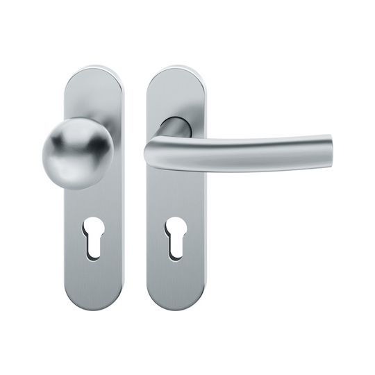 FSB Wechselgarnitur 72 1107; Material: Edelstahl; Befestigungsart: verdeckt verschraubt; Befestigungstechnik: mit Stütznocken; Vierkant: 8 mm; Befestigungssystem: Stiftverbindung; Abdeckung: Kurzschild; Lagerung: Ausgleichslager® 3,festdrehbar; Form: oval; Benutzerklasse: Klasse 4; Einsatzbereich: Objekttür; Basis: Wechselgarnitur; Lochung: Profilzylinder gelocht; Entfernung: 72 mm; Türstärke min.: 39 mm; Türstärke max.: 48 mm; DIN-Richtung: DIN Rechts; Anschlagrichtung: Drücker rechts zeigend; Breite: 45 mm; Länge: 185 mm; Oberfläche: fein matt; Farbton: edelstahl; Norm: DIN EN 1906; Türart: Außentüren; Drückerbefestigung: Stabil-Wechselstift mit Rolle; Eigenschaft: Knopf fest auf Schild; Knopfdurchmesser: 50 mm; Knopfhöhe: 66 mm; Türwerkstoff: Holz,Stahl; Lieferung: mit Befestigungsmaterial; Betätigungswinkel max.: 35 °; Drückerhöhe: 58 mm; Drückerlänge: 136 mm; Design: Hartmut Weise; Ausführung: mit Knopf 0802; Knopfform: Kugelform; Schildstärke außen: 7 mm; Schildstärke innen: 7 mm; Drückerform: Gehrung,gebogen