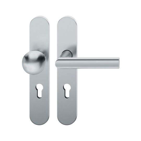 FSB Wechselgarnitur 72 1108; Material: Edelstahl; Befestigungsart: verdeckt verschraubt; Befestigungstechnik: mit Stütznocken; Vierkant: 8 mm; Befestigungssystem: Stiftverbindung; Abdeckung: Langschild; Lagerung: Ausgleichslager® 3,festdrehbar; Form: oval; Benutzerklasse: Klasse 4; Einsatzbereich: Objekttür; Basis: Wechselgarnitur; Lochung: Profilzylinder gelocht; Entfernung: 72 mm; Türstärke min.: 39 mm; Türstärke max.: 48 mm; Knopfhöhe: 66 mm; Knopfform: Kugelform; DIN-Richtung: DIN Links; Norm: DIN EN 1906; Eigenschaft: Knopf fest auf Schild; Breite: 45 mm; Länge: 245 mm; Oberfläche: fein matt; Farbton: edelstahl; Türart: Außentüren; Drückerbefestigung: Stabil-Wechselstift mit Rolle; Anschlagrichtung: Drücker links zeigend; Knopfdurchmesser: 50 mm; Türwerkstoff: Holz,Stahl; Lieferung: mit Befestigungsmaterial; Betätigungswinkel max.: 35 °; Drückerhöhe: 56 mm; Drückerlänge: 135 mm; Design: Hartmut Weise; Ausführung: mit Knopf 0802; Schildstärke außen: 7 mm; Schildstärke innen: 7 mm; Drückerform: Gehrung,gerade