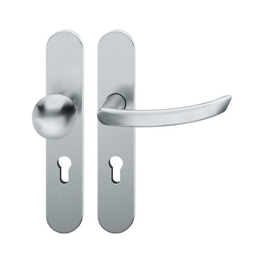 FSB Wechselgarnitur 72 1119; Material: Edelstahl; Befestigungsart: verdeckt verschraubt; Befestigungstechnik: mit Stütznocken; Vierkant: 8 mm; Befestigungssystem: Stiftverbindung; Abdeckung: Langschild; Lagerung: festdrehbar,Ausgleichslager® 3; Form: oval; Benutzerklasse: Klasse 4; Einsatzbereich: Objekttür; Basis: Wechselgarnitur; Lochung: Profilzylinder gelocht; Entfernung: 72 mm; Türstärke min.: 39 mm; Türstärke max.: 48 mm; Knopfhöhe: 66 mm; Knopfform: Kugelform; DIN-Richtung: DIN Links; Norm: DIN EN 1906; Eigenschaft: Knopf fest auf Schild; Breite: 45 mm; Länge: 245 mm; Oberfläche: fein matt; Farbton: edelstahl; Türart: Außentüren; Drückerbefestigung: Stabil-Wechselstift mit Rolle; Anschlagrichtung: Drücker links zeigend; Knopfdurchmesser: 50 mm; Türwerkstoff: Holz,Stahl; Lieferung: mit Befestigungsmaterial; Betätigungswinkel max.: 35 °; Drückerhöhe: 62 mm; Drückerlänge: 149 mm; Design: Hartmut Weise; Ausführung: mit Knopf 0802; Schildstärke außen: 7 mm; Schildstärke innen: 7 mm; Drückerform: gebogen