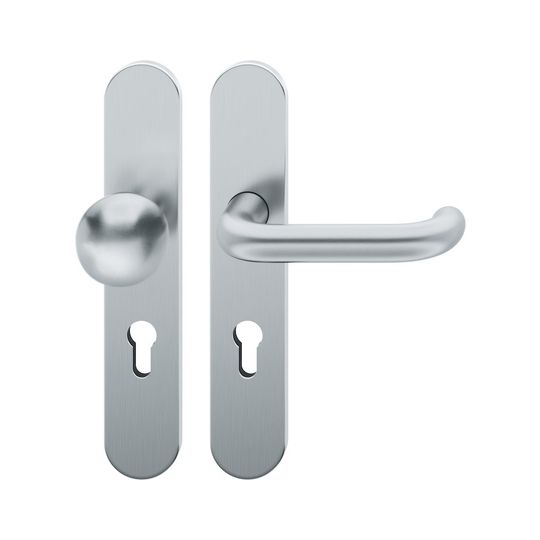 FSB Wechselgarnitur 72 1146; Material: Edelstahl; Befestigungsart: verdeckt verschraubt; Befestigungstechnik: mit Stütznocken; Vierkant: 8 mm; Befestigungssystem: Stiftverbindung; Abdeckung: Langschild; Lagerung: Ausgleichslager® 3,festdrehbar; Form: oval; Benutzerklasse: Klasse 4; Einsatzbereich: Objekttür; Basis: Wechselgarnitur; Lochung: Profilzylinder gelocht; Entfernung: 72 mm; Türstärke min.: 39 mm; Türstärke max.: 48 mm; Knopfhöhe: 66 mm; Knopfform: Kugelform; DIN-Richtung: DIN Links; Norm: DIN EN 1906; Eigenschaft: Knopf fest auf Schild; Drückerdurchmesser: 20 mm; Breite: 45 mm; Länge: 245 mm; Oberfläche: fein matt; Farbton: edelstahl; Türart: Außentüren; Drückerbefestigung: Stabil-Wechselstift mit Rolle; Anschlagrichtung: Drücker links zeigend; Knopfdurchmesser: 50 mm; Türwerkstoff: Holz,Stahl; Lieferung: mit Befestigungsmaterial; Betätigungswinkel max.: 35 °; Drückerhöhe: 62 mm; Drückerlänge: 142 mm; Ausführung: mit Knopf 0802; Schildstärke außen: 7 mm; Schildstärke innen: 7 mm; Drückerform: U-Form