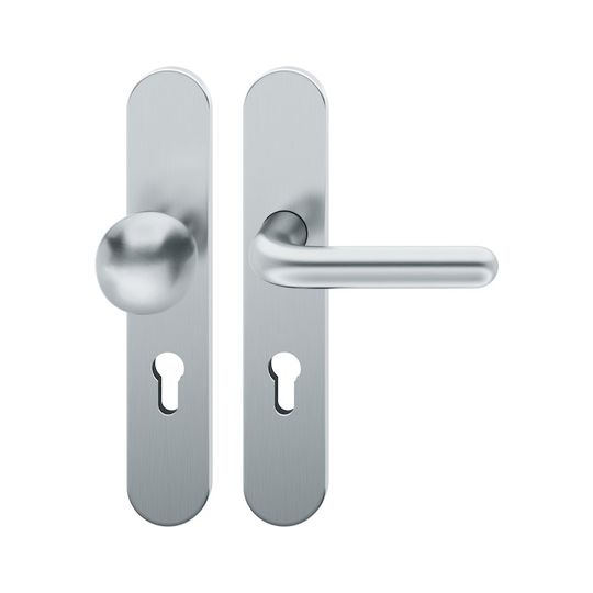 FSB Wechselgarnitur 72 1147; Material: Edelstahl; Befestigungsart: verdeckt verschraubt; Befestigungstechnik: mit Stütznocken; Vierkant: 8 mm; Befestigungssystem: Stiftverbindung; Abdeckung: Langschild; Lagerung: Ausgleichslager® 3,festdrehbar; Form: oval; Benutzerklasse: Klasse 4; Einsatzbereich: Objekttür; Basis: Wechselgarnitur; Lochung: Profilzylinder gelocht; Entfernung: 72 mm; Türstärke min.: 39 mm; Türstärke max.: 48 mm; Knopfhöhe: 66 mm; Knopfform: Kugelform; DIN-Richtung: DIN Links; Norm: DIN EN 1906; Eigenschaft: Knopf fest auf Schild; Drückerdurchmesser: 20 mm; Breite: 45 mm; Länge: 245 mm; Oberfläche: fein matt; Farbton: edelstahl; Türart: Außentüren; Drückerbefestigung: Stabil-Wechselstift mit Rolle; Anschlagrichtung: Drücker links zeigend; Knopfdurchmesser: 50 mm; Türwerkstoff: Holz,Stahl; Lieferung: mit Befestigungsmaterial; Betätigungswinkel max.: 35 °; Drückerhöhe: 62 mm; Drückerlänge: 132 mm; Ausführung: mit Knopf 0802; Schildstärke außen: 7 mm; Schildstärke innen: 7 mm; Drückerform: L-Form,gerade