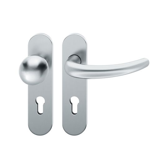 FSB Wechselgarnitur 72 1160; Material: Edelstahl; Befestigungsart: verdeckt verschraubt; Befestigungstechnik: mit Stütznocken; Vierkant: 8 mm; Befestigungssystem: Stiftverbindung; Abdeckung: Kurzschild; Lagerung: festdrehbar,Ausgleichslager® 3; Form: oval; Benutzerklasse: Klasse 4; Einsatzbereich: Objekttür; Basis: Wechselgarnitur; Lochung: Profilzylinder gelocht; Entfernung: 72 mm; Türstärke min.: 39 mm; Türstärke max.: 48 mm; DIN-Richtung: DIN Links; Anschlagrichtung: Drücker links zeigend; Breite: 45 mm; Länge: 185 mm; Oberfläche: fein matt; Farbton: edelstahl; Norm: DIN EN 1906; Türart: Außentüren; Drückerbefestigung: Stabil-Wechselstift mit Rolle; Eigenschaft: Knopf fest auf Schild; Knopfdurchmesser: 50 mm; Knopfhöhe: 66 mm; Türwerkstoff: Holz,Stahl; Lieferung: mit Befestigungsmaterial; Betätigungswinkel max.: 35 °; Drückerhöhe: 65 mm; Drückerlänge: 150 mm; Ausführung: mit Knopf 0802; Knopfform: Kugelform; Schildstärke außen: 7 mm; Schildstärke innen: 7 mm; Drückerform: gebogen