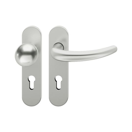 FSB Wechselgarnitur 72 1160; Material: Aluminium; Befestigungsart: verdeckt verschraubt; Befestigungstechnik: mit Stütznocken; Vierkant: 8 mm; Befestigungssystem: Stiftverbindung; Abdeckung: Kurzschild; Lagerung: festdrehbar,Ausgleichslager® 3; Form: oval; Benutzerklasse: Klasse 4; Einsatzbereich: Objekttür; Basis: Wechselgarnitur; Lochung: Profilzylinder gelocht; Entfernung: 72 mm; Türstärke min.: 39 mm; Türstärke max.: 48 mm; DIN-Richtung: DIN Links; Anschlagrichtung: Drücker links zeigend; Breite: 45 mm; Länge: 185 mm; Oberfläche: eloxiert; Farbton: naturfarbig; Norm: DIN EN 1906; Türart: Außentüren; Drückerbefestigung: Stabil-Wechselstift mit Rolle; Eigenschaft: Knopf fest auf Schild; Knopfdurchmesser: 50 mm; Knopfhöhe: 70 mm; Türwerkstoff: Holz,Stahl; Lieferung: mit Befestigungsmaterial; Betätigungswinkel max.: 35 °; Drückerhöhe: 65 mm; Drückerlänge: 150 mm; Ausführung: mit Knopf 0802; Knopfform: Kugelform; Schildstärke außen: 7 mm; Schildstärke innen: 7 mm; Drückerform: gebogen