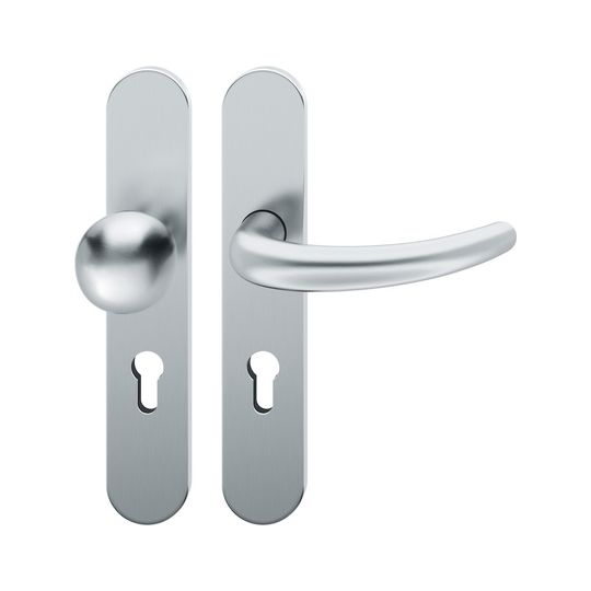 FSB Wechselgarnitur 72 1160; Material: Edelstahl; Befestigungsart: verdeckt verschraubt; Befestigungstechnik: mit Stütznocken; Vierkant: 8 mm; Befestigungssystem: Stiftverbindung; Abdeckung: Langschild; Lagerung: Ausgleichslager® 3,festdrehbar; Form: oval; Benutzerklasse: Klasse 4; Einsatzbereich: Objekttür; Basis: Wechselgarnitur; Lochung: Profilzylinder gelocht; Entfernung: 72 mm; Türstärke min.: 39 mm; Türstärke max.: 48 mm; Knopfhöhe: 66 mm; Knopfform: Kugelform; DIN-Richtung: DIN Links; Norm: DIN EN 1906; Eigenschaft: Knopf fest auf Schild; Breite: 45 mm; Länge: 245 mm; Oberfläche: fein matt; Farbton: edelstahl; Türart: Außentüren; Drückerbefestigung: Stabil-Wechselstift mit Rolle; Anschlagrichtung: Drücker links zeigend; Knopfdurchmesser: 50 mm; Türwerkstoff: Holz,Stahl; Lieferung: mit Befestigungsmaterial; Betätigungswinkel max.: 35 °; Drückerhöhe: 65 mm; Drückerlänge: 150 mm; Ausführung: mit Knopf 0802; Schildstärke außen: 7 mm; Schildstärke innen: 7 mm; Drückerform: gebogen