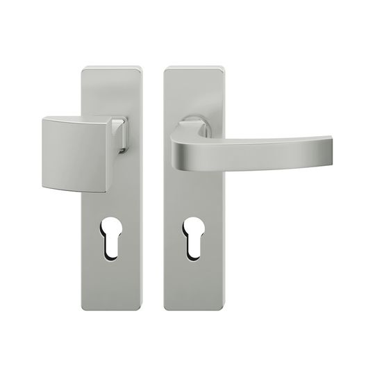 FSB Wechselgarnitur 72 1163; Material: Aluminium; Befestigungsart: verdeckt verschraubt; Befestigungstechnik: mit Stütznocken; Vierkant: 8 mm; Befestigungssystem: Stiftverbindung; Abdeckung: Kurzschild; Lagerung: festdrehbar,Ausgleichslager® 3; Form: eckig; Benutzerklasse: Klasse 4; Einsatzbereich: Objekttür; Basis: Wechselgarnitur; Lochung: Profilzylinder gelocht; Entfernung: 72 mm; Türstärke min.: 39 mm; Türstärke max.: 48 mm; DIN-Richtung: DIN Links; Anschlagrichtung: Drücker links zeigend; Breite: 45 mm; Länge: 185 mm; Oberfläche: eloxiert; Farbton: naturfarbig; Norm: DIN EN 1906; Türart: Außentüren; Drückerbefestigung: Stabil-Wechselstift mit Rolle; Eigenschaft: Knopf fest auf Schild; Knopfdurchmesser: 50 mm; Knopfhöhe: 44 mm; Türwerkstoff: Holz,Stahl; Lieferung: mit Befestigungsmaterial; Betätigungswinkel max.: 35 °; Drückerhöhe: 54 mm; Drückerlänge: 125 mm; Design: Hans Kollhoff; Ausführung: mit Knopf 0829; Knopfform: rund; Schildstärke außen: 7 mm; Schildstärke innen: 7 mm; Drückerform: gebogen