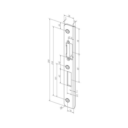effeff Winkelschließblech 45B; Produkttyp: Winkelschließblech; Produkttyp (Hersteller): Winkelschließblech; Ausfräsung: mit Fallen und Riegelausschnitt; Material: Edelstahl; Einsatzbereich: Türrahmen; Form: rund; DIN-Richtung: DIN Links; Farbton: edelstahl; Oberfläche: geschliffen; Schließblechbreite: 28 mm; Schließblechlänge: 250 mm; Schließblechtiefe: 9 mm; Materialstärke: 3 mm; Radius: 8 °; Zusatzinformation: mit 3 Rundbolzen 16x8mm