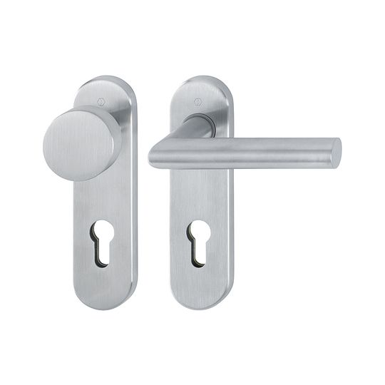 HOPPE Wechselgarnitur Amsterdam E58/353K/1400Z; Produkttyp: Wechselgarnitur; Produkttyp (Hersteller): Wechselgarnitur; Ausführung: Kurzschild; Befestigungsart: verdeckt verschraubt; Befestigungstechnik: mit Stütznocken; Form: oval; Vierkant: 8 mm; Material: Edelstahl; Material Unterkonstruktion: Stahl; Form Türgriff (innen): Gehrung; Form Türgriff (außen): Flachknopf; Ausführung Türgriff (außen): fest; Gewinde Knopf/Griffplatte: M12; Durchmesser Türgriff (außen): 50 mm; Länge Türgriff (innen): 125 mm; Höhe Türgriff (innen): 59 mm; Höhe Türgriff (außen): 40 mm; Schildbreite außen: 44 mm; Schildbreite innen: 44 mm; Schildlänge außen: 165 mm; Schildlänge innen: 165 mm; Schildstärke außen: 8 mm; Schildstärke innen: 8 mm; Lagerung: wartungsfreies Gleitlager; Einsatzbereich: Objekttür,Wohnungseingangstür; Türart: Vollblatt; Türwerkstoff: Holz,Stahl; Norm: DIN EN 1906; Lochung: Profilzylinder gelocht; Entfernung: 72 mm; DIN-Richtung: DIN Links-Rechts; Farbe: grau; Farbton: edelstahl matt; Ausführung Vierkant: Rollenwechselstift; Türstärke min.: 35 mm; Türstärke max.: 45 mm