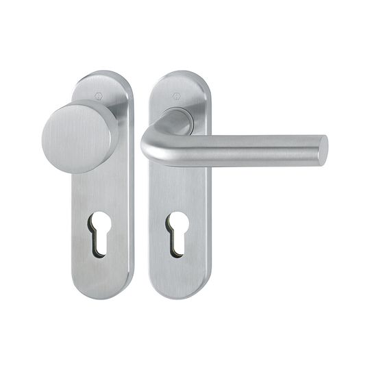 HOPPE Wechselgarnitur Bonn E58/353K/150Z; Produkttyp: Wechselgarnitur; Produkttyp (Hersteller): Wechselgarnitur; Ausführung: Kurzschild; Befestigungsart: verdeckt verschraubt; Befestigungstechnik: mit Stütznocken; Form: oval; Vierkant: 8 mm; Material: Edelstahl; Material Unterkonstruktion: Stahl; Form Türgriff (innen): L-Form; Form Türgriff (außen): Flachknopf; Ausführung Türgriff (außen): fest; Gewinde Knopf/Griffplatte: M12; Durchmesser Türgriff (außen): 50 mm; Länge Türgriff (innen): 130 mm; Höhe Türgriff (innen): 68 mm; Höhe Türgriff (außen): 40 mm; Schildbreite außen: 44 mm; Schildbreite innen: 44 mm; Schildlänge außen: 165 mm; Schildlänge innen: 165 mm; Schildstärke außen: 8 mm; Schildstärke innen: 8 mm; Lagerung: wartungsfreies Gleitlager; Einsatzbereich: Objekttür,Wohnungseingangstür; Türart: Vollblatt; Türwerkstoff: Holz,Stahl; Norm: DIN EN 1906; Lochung: Profilzylinder gelocht; Entfernung: 72 mm; DIN-Richtung: DIN Links-Rechts; Farbe: grau; Farbton: edelstahl matt; Ausführung Vierkant: Rollenwechselstift; Türstärke min.: 35 mm; Türstärke max.: 45 mm