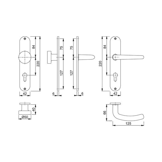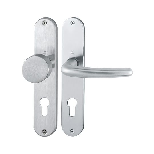 HOPPE Wechselgarnitur Denver E58/302/1310Z; Produkttyp: Wechselgarnitur; Produkttyp (Hersteller): Wechselgarnitur; Ausführung: Langschild; Befestigungsart: sichtbar verschraubt; Befestigungstechnik: ohne Stütznocken; Form: oval; Vierkant: 8 mm; Material: Edelstahl; Form Türgriff (innen): gebogen; Form Türgriff (außen): Flachknopf; Ausführung Türgriff (außen): fest; Gewinde Knopf/Griffplatte: M12; Durchmesser Türgriff (außen): 50 mm; Länge Türgriff (innen): 125 mm; Höhe Türgriff (innen): 66 mm; Höhe Türgriff (außen): 40 mm; Schildbreite außen: 42 mm; Schildbreite innen: 42 mm; Schildlänge außen: 220 mm; Schildlänge innen: 220 mm; Schildstärke außen: 6 mm; Schildstärke innen: 6 mm; Lagerung: wartungsfreies Gleitlager; Einsatzbereich: Objekttür,Wohnungseingangstür; Türart: Vollblatt; Türwerkstoff: Holz,Stahl; Norm: DIN EN 1906; Lochung: Profilzylinder gelocht; Entfernung: 72 mm; DIN-Richtung: DIN Links-Rechts; Farbe: grau; Farbton: edelstahl matt; Ausführung Vierkant: Rollenwechselstift; Türstärke min.: 35 mm; Türstärke max.: 45 mm