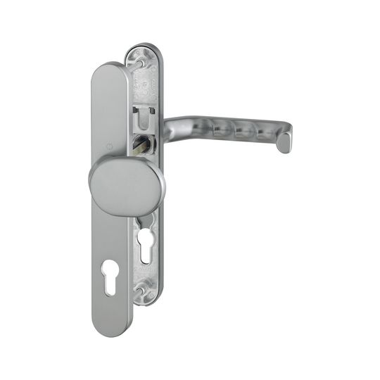 HOPPE Wechselgarnitur Liverpool 86G/3357N/1313G; Produkttyp: Wechselgarnitur; Produkttyp (Hersteller): Wechselgarnitur; Ausführung: Langschild; Befestigungsart: verdeckt verschraubt; Befestigungstechnik: mit Stütznocken; Form: oval; Vierkant: 8 mm; Material: Aluminium; Material Unterkonstruktion: Zamak; Form Türgriff (innen): gekröpft; Form Türgriff (außen): gekröpft; Ausführung Türgriff (außen): fest; Gewinde Knopf/Griffplatte: M12; Breite Türgriff (außen): 87 mm; Länge Türgriff (innen): 146 mm; Länge Türgriff (außen): 54 mm; Höhe Türgriff (innen): 60 mm; Höhe Türgriff (außen): 50 mm; Schildbreite außen: 36 mm; Schildbreite innen: 36 mm; Schildlänge außen: 250 mm; Schildlänge innen: 250 mm; Schildstärke außen: 10 mm; Schildstärke innen: 10 mm; Lagerung: wartungsfreies Gleitlager,festdrehbar,mit Rückholfeder; Einsatzbereich: Haustür; Türart: Rohrrahmen; Türwerkstoff: Aluminium,Kunststoff; Lochung: Profilzylinder gelocht; Entfernung: 92 mm; DIN-Richtung: DIN Links-Rechts; Farbe: grau; Farbton: stahlfarbig; Oberfläche: eloxiert; Ausführung Vierkant: Rollenwechselstift; Türstärke min.: 67 mm; Türstärke max.: 72 mm