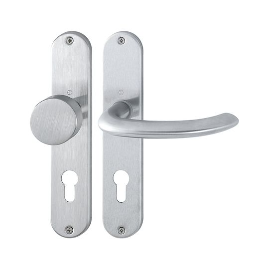 HOPPE Wechselgarnitur Marseille E58/302/1138Z; Produkttyp: Wechselgarnitur; Produkttyp (Hersteller): Wechselgarnitur; Ausführung: Langschild; Befestigungsart: sichtbar verschraubt; Befestigungstechnik: ohne Stütznocken; Form: oval; Vierkant: 8 mm; Material: Edelstahl; Form Türgriff (innen): gebogen; Form Türgriff (außen): Flachknopf; Ausführung Türgriff (außen): fest; Gewinde Knopf/Griffplatte: M12; Durchmesser Türgriff (außen): 50 mm; Länge Türgriff (innen): 144 mm; Höhe Türgriff (innen): 69 mm; Höhe Türgriff (außen): 40 mm; Schildbreite außen: 42 mm; Schildbreite innen: 42 mm; Schildlänge außen: 220 mm; Schildlänge innen: 220 mm; Schildstärke außen: 6 mm; Schildstärke innen: 6 mm; Lagerung: wartungsfreies Gleitlager; Einsatzbereich: Objekttür,Wohnungseingangstür; Türart: Vollblatt; Türwerkstoff: Holz,Stahl; Norm: DIN EN 1906; Lochung: Profilzylinder gelocht; Entfernung: 72 mm; DIN-Richtung: DIN Links-Rechts; Farbe: grau; Farbton: edelstahl matt; Ausführung Vierkant: Rollenwechselstift; Türstärke min.: 35 mm; Türstärke max.: 45 mm