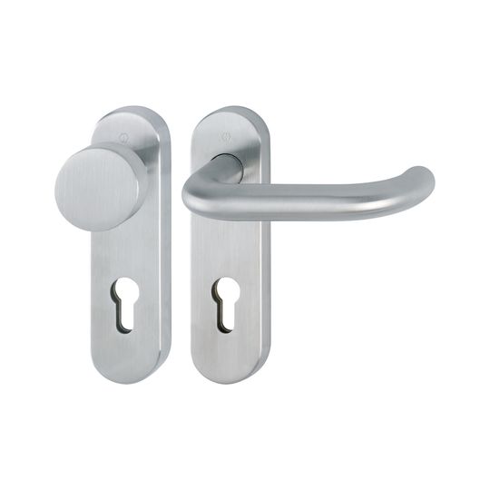 HOPPE Wechselgarnitur Paris E58/353KH/138; Produkttyp: Wechselgarnitur; Produkttyp (Hersteller): Wechselgarnitur; Ausführung: Kurzschild; Befestigungsart: verdeckt verschraubt; Befestigungstechnik: mit Stütznocken; Form: oval; Vierkant: 8 mm; Material: Edelstahl; Material Unterkonstruktion: Stahl; Form Türgriff (innen): U-Form; Form Türgriff (außen): Flachknopf; Ausführung Türgriff (außen): fest; Gewinde Knopf/Griffplatte: M12; Durchmesser Türgriff (außen): 50 mm; Länge Türgriff (innen): 141 mm; Höhe Türgriff (innen): 66 mm; Höhe Türgriff (außen): 32 mm; Schildbreite außen: 44 mm; Schildbreite innen: 44 mm; Schildlänge außen: 165 mm; Schildlänge innen: 165 mm; Schildstärke außen: 10 mm; Schildstärke innen: 10 mm; Lagerung: wartungsfreies Gleitlager,mit Rückholfeder,festdrehbar; Einsatzbereich: Objekttür,Wohnungseingangstür; Türart: Vollblatt; Türwerkstoff: Holz,Stahl; Norm: DIN EN 1906; Lochung: Profilzylinder gelocht; Entfernung: 72 mm; DIN-Richtung: DIN Links-Rechts; Farbe: grau; Farbton: edelstahl matt; Ausführung Vierkant: Rollenwechselstift; Türstärke min.: 40 mm; Türstärke max.: 45 mm