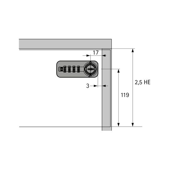 • Beim Beistellcontainer mit SysTech Zarge erhöht sich die Blendenhöhe auf 3 Höheneinheiten, Abstandsmaß Blendenunterkante bis Mitte Schlossbohrung 146,5 mm