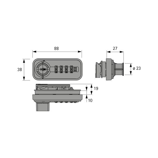 Vierrädriges Zahlenkombinationsschloss für indiviuelle Kombinationen, Codierung in geöffnetem Zustand über Codiertaste, Codierung und Codieränderung ohne zusätzliche Hilfsmittel, Verwischtechnik zu...